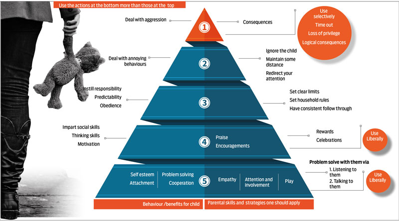 As per the pyramid (below), the parenting strategies on the base should be used more liberally than the ones on the top of the pyramid