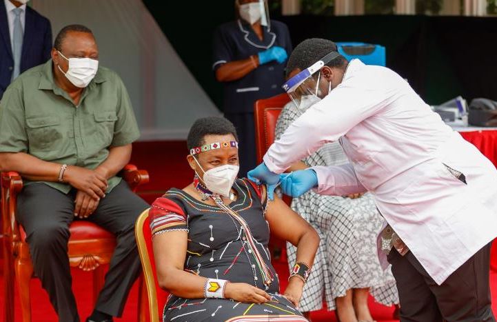 Joining the president in being vaccinated was First Lady Margaret Kenyatta. The jab was administered at State House after the president addressed the country on the pandemic and revised containment measures.