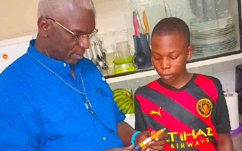 Samson Wahore prepares an insulin pen before his son gets injected in Nairobi. [Rodgers Otiso, Standard]