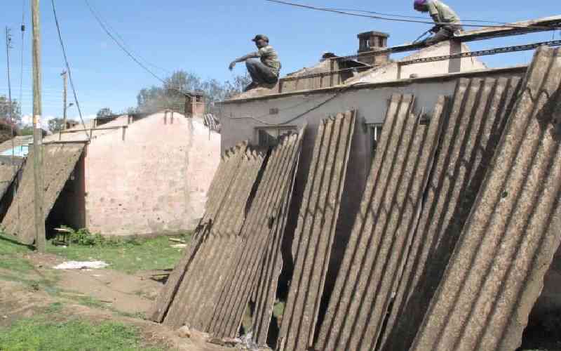 Workers remove asbestos roofing materials in Naivasha in a project sponsored by Nakuru County government at a cost of Sh10 million. [File, Standard]