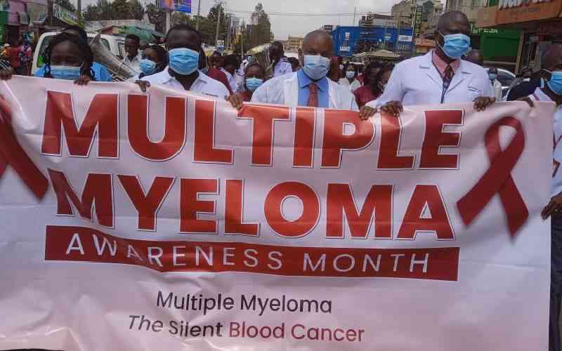 Moi Teaching and Referral Hospital staff led by CEO Wilson Aruasa, march in Eldoret town to create awareness about multiple myeloma cancer. [File, Standard]
