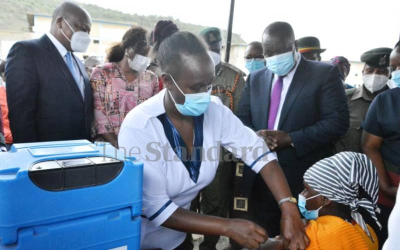 Interior CS Fred Matiang’i and Health CS Mutahi Kagwe overseeing the vaccination of an inmate at Naivasha GK Prison. [Antony Gitonga, Standard]