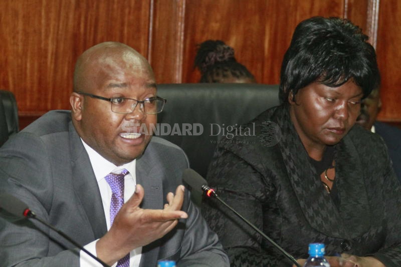 Lands Principal Secretary Nicholas Muraguri (L) accompanied by Assistant Accounts General Mary Wanyonyi when they appeared before the National Assembly Public Accounts Committee on audit queries at Parliament. [Boniface Okendo/Standard]