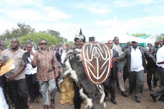 Homa Bay, Kenya: CORD leader Raila Odinga joined thousands of mourners dressed in traditional regalia at Waondo primary school during the burial ceremony of Homabay Senator Otieno Kajwang.