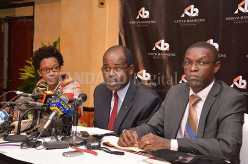 KBA chief executive Habil Olaka (centre) addressing journalists yesterday. With him are Nuru Mugambi, KBA Director of Communications (left) and Jared Osoro, KBA Director of Research. [PHOTO: WILBERFORCE OKWIRI/Standard]