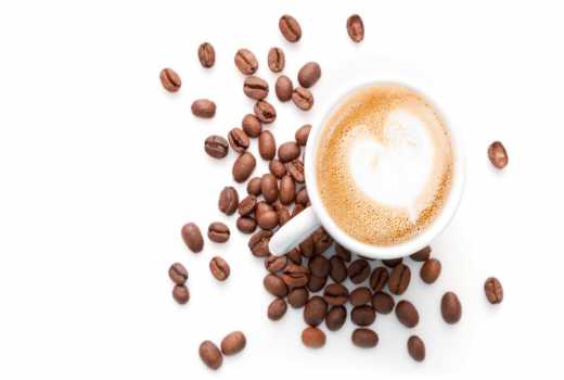 Small cup of cappuccino with coffee beans and heart shaped milk foam, top view isolated on white background