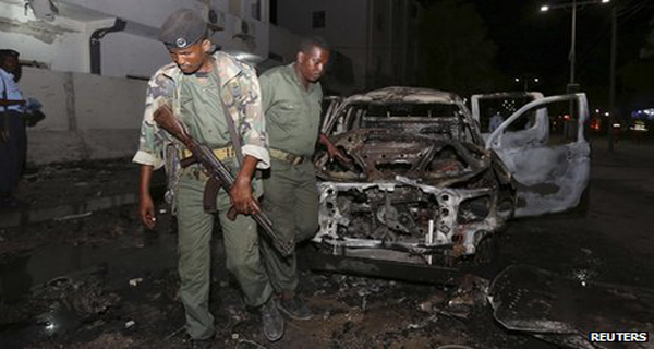 Interior Minister Abdikarim Hussein Guled told the BBC that 15 people had been injured after a car exploded outside the Hotel Maka.