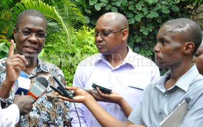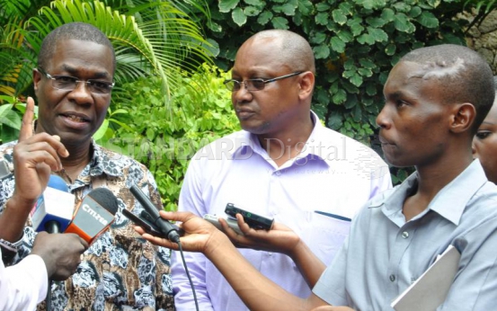 Ugunja MP James Opiyo (left) and Bomet Central MP Ronald Tonui hold a joint press briefing at Severin Hotel in Mombasa County. The MPs asked the president to ensure Devolution CS Anne Waiguru steps aside for investigations into the National Youth Service scandal. PHOTO: KELVIN KARANI