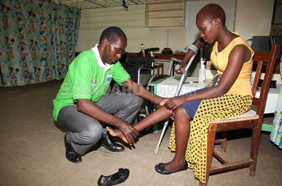 Paul Kirui senior occupational therapist at KNH examines Catherine Alice Malita undergoing physiotherapy at KNH. PHOTO: WILBERFORCE OKWIRI
