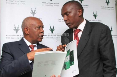 East African Cables CEO Peter Arina (left) and Chairman Zephaniah Mbugua during the company’s AGM in Nairobi. [ PHOTO: DAVID NJAAGA/STANDARD]