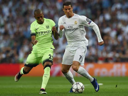 Manchester City's Brazilian midfielder Fernandinho (L) vies with Real Madrid's Portuguese forward Cristiano Ronaldo during the UEFA Champions League semi-final second leg football match Real Madrid CF vs Manchester City FC at the Santiago Bernabeu stadium in Madrid, on May 4, 2016. / AFP PHOTO