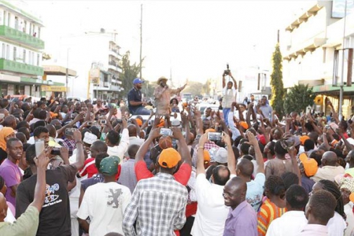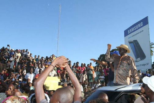 (Photo: Maarufu Mohamed/STANDARD)ODM Party Leader Raila Odinga adressing locals at Changmwe, Mombasa. (PHOTO BY MAARUFU MOHAMED/STANDARD)