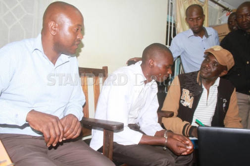 Plain clothes police officers interrogate Peter Nyapeni[center] a class 7 drop out who has been treating patients at Kisii Teaching and Referral Hospital a close to one year now on 24/05/2017. The suspect is been questioned by Kisii criminal investigation officers waiting to be arraigned in court.[photos sammy Omingo/standard]
