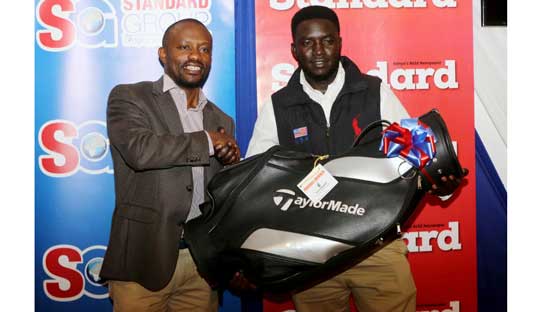 John Kamais receive the top the prize from Standard Group Acting Chief Executive Officer Orlando Lyomu after winning the Standard County Classics Golf series at Nakuru Golf Club on April 15,2018.Photo:Kipsang Joseph/Standard