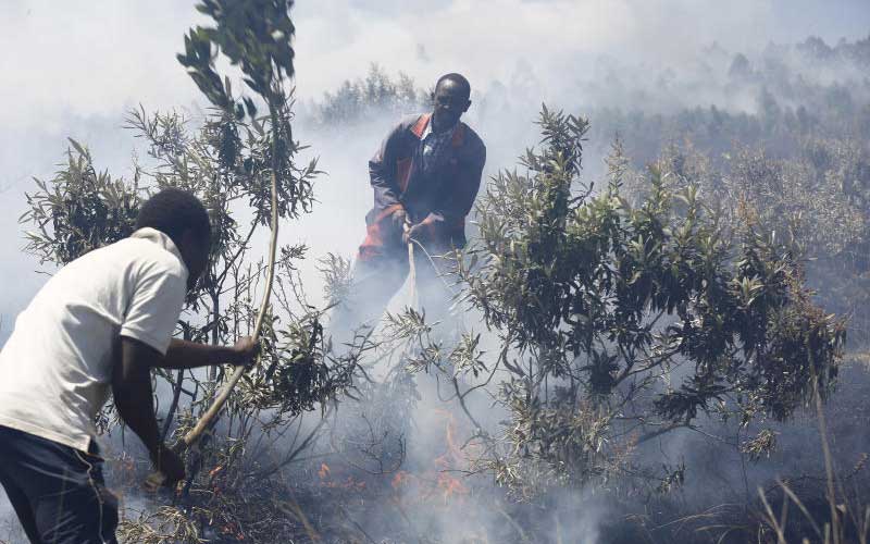 Locals using twigs to put off a fire at Menengai forest in Nakuru on January 31, 2019. [Kipsang Joseph, Standard]