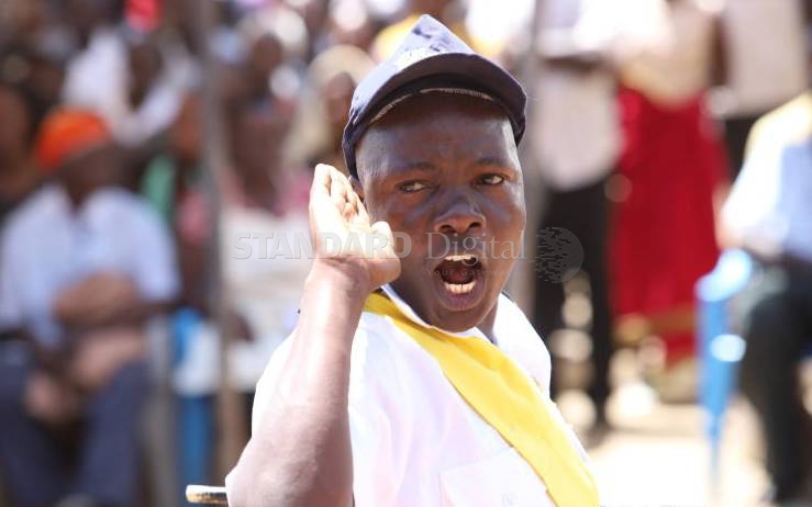 Private guards' parade commander from Bedrock Security commands other guards as they march past dais at Jomo Kenyatta Sports Ground in Kisumu during the Labour Day celebrations. [Denish Ochieng/ Standard]