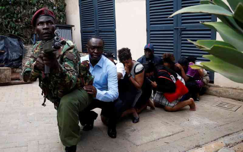 A police officer rescues people during the terror attack on DusitD2 Complex in Nairobi. [File, Standard]