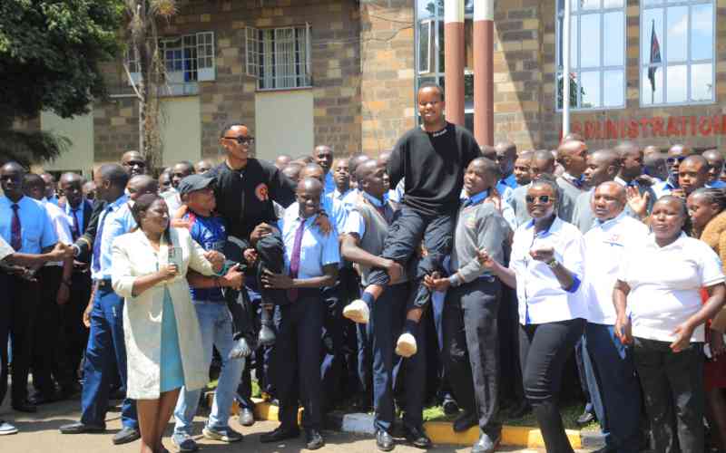 Sunshine Secondary School students and teachers celebrate the KCSE 2025 results at the school on January 9, 2026. [Elvis Ogina, Standard]