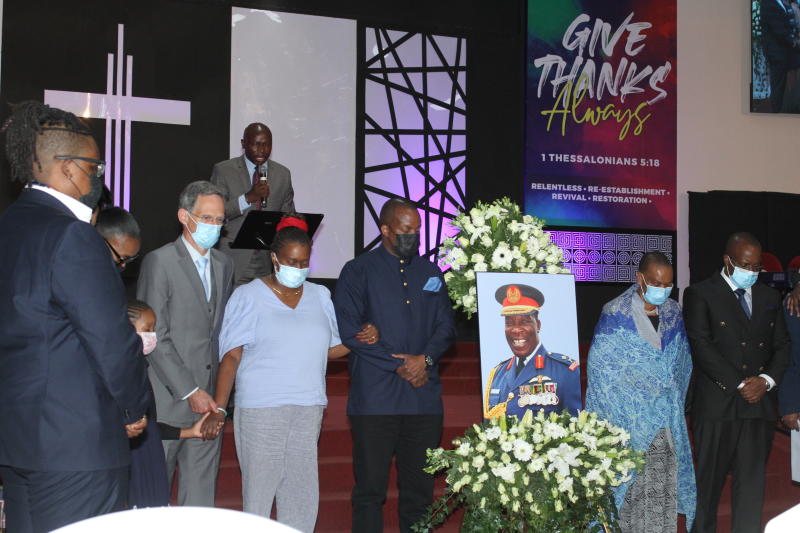 Lt Gen (Rtd) Nick Leshan’s widow, Salome Naanyu, (second right) is joined by family members and friends for a requiem Mass at Ridgeways Baptist Church. [Collins Kweyu, Standard]
