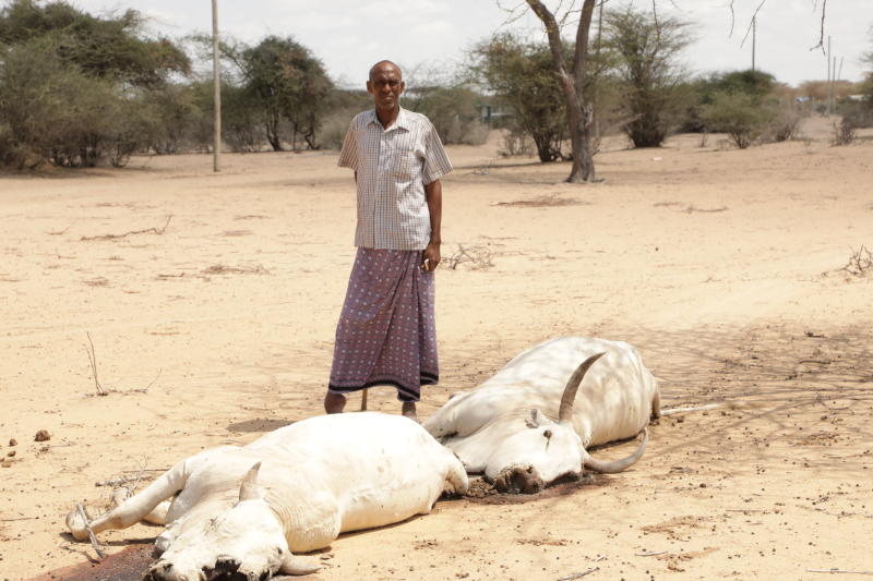 Omar Aden Qassim stands in between carcasses of his dead livestock in Liboi sub-county in Garissa. [Courtesy]