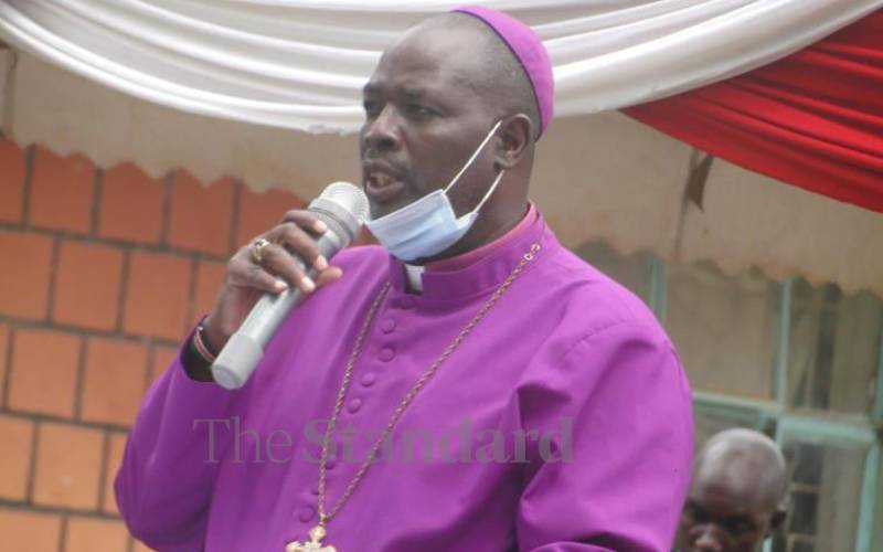 Archbishop Jackson Ole Sapit addressing the faithful at Majengo Mixed Secondary School in Bondo, Siaya County. [Isaiah Gwengi, Standard]