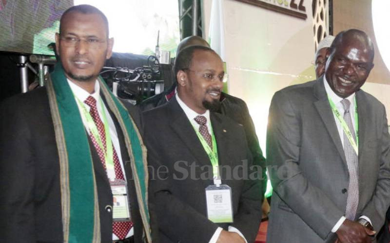 IEBC Chairperson Wafula Chebukati (right) with Commissioners Abdi Guliye (left) and Boya Molu during a past IEBC conference at the KICC. [Boniface Okendo, Standard]
