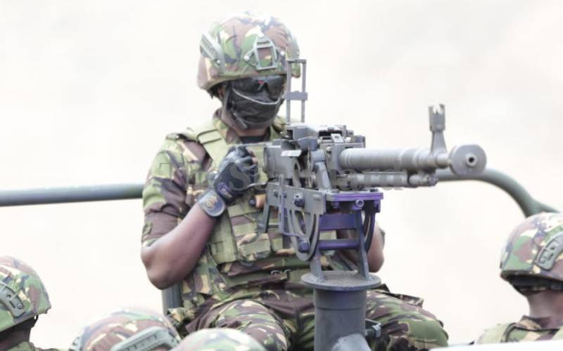 KDF soldier parades a machine gun during a past military exercise. [Boniface Okendo, Standard]