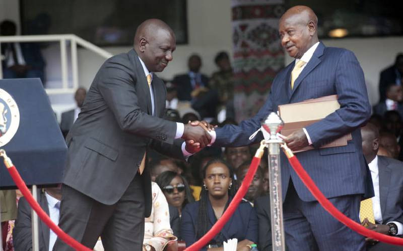 President William Ruto shakes hands with his Ugandan counterpart during his swearing in at Kasarani Stadium on September 13, 2022. [Boniface Okendo, Standard]