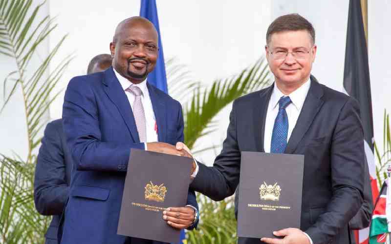 Trade CS Moses Kuria exchange signed documents with the European Commission Executive Vice-President and European Union Trade Commissioner Valdis Dombrovskis at State House, Nairobi. [PCS, Standard]