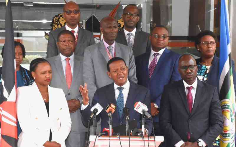 Foreign affairs CS Dr Alred Mutua flanked by officials from the ministry during the press briefing. [Courtesy, Dr Alfred Mutua]