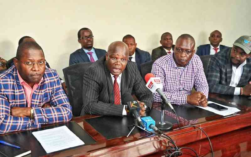 Dr Charles Mukhwaya-General Secretary (TUC-Ke) and Secretary(KUSU), Tom Odege-Secretary General (UKCS), and Simon Sang-Secretary General Dock Workers Union address the press at the University Academic Staff Union (UASU) head office on April 29, 2024. [Robert Tomno, Standard]