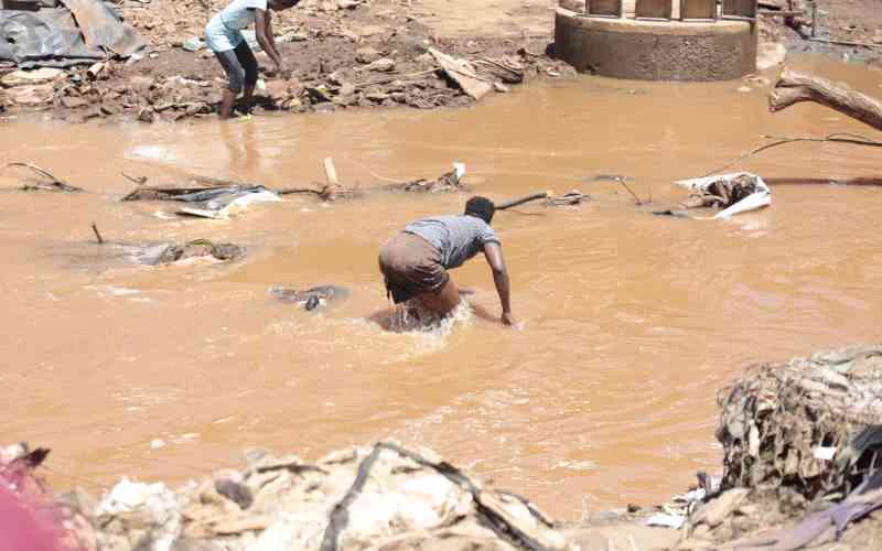 A woman risk her life to cross the overflown Nairobi River in Mathare 4B to Mathare 4A on May 11, 2024[Boniface Okendo, Standard]