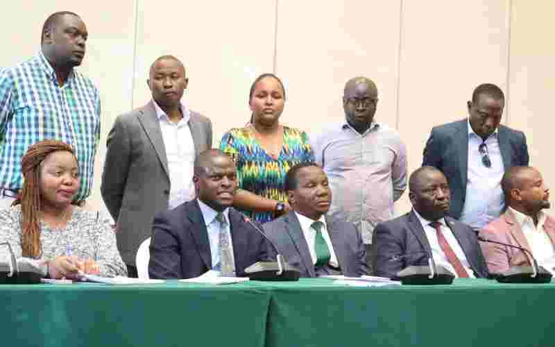 Budget and Appropriation Committee members led by Chairman Ndindi Nyoro(2nd left) addressing the media during the supplementary budget estimates at Argyle Hotel, Machakos on May 29, 2024.[Boniface Okendo Standard]