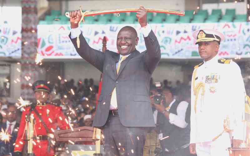 President William Ruto displays a sword of power handed over to him by outgoing President Uhuru Kenyatta after swearing in at Kasarani stadium on September 13, 2022. [Denish Ochieng, Standard]
