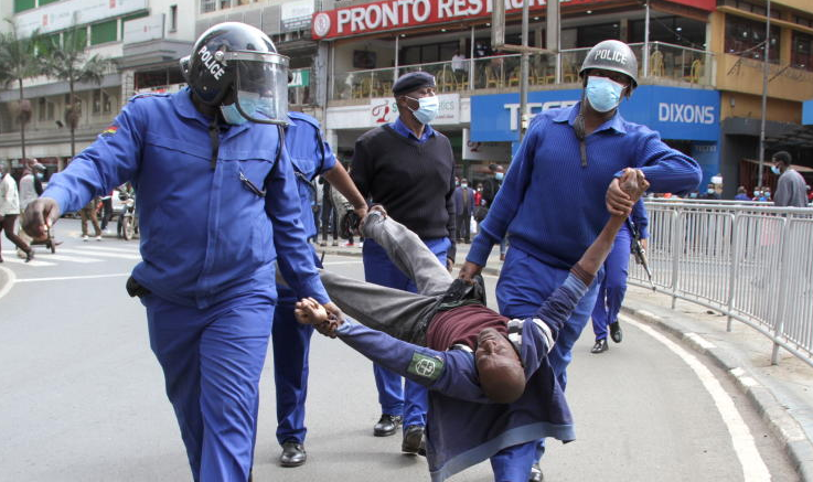Anti-riot police arrest an activist along Kimathi Street in Nairobi, during the marking of Saba Saba Day in Nairobi. [Standard, File]