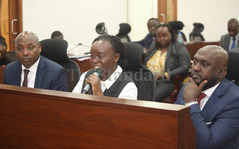 Health CS Deborah Barasa (center), PS Medical Services Harry Kimtai (left) and SHA Chairperson Dr Abdi Mohamed before National Assembly's Health Committee to discuss the rollout of the Social Health Insurance Fund (SHIF) in preparation for the Universal Health Coverage launch on 1st October 2024 [Elvis Ogina, Standard]