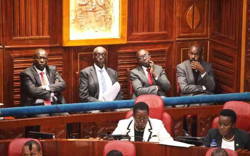 From left: Deputy President Rigathi Gachagua and his legal team, lawyers Paul Muite, Njiru Ndegwa and Elisha Ongoya during Senate impeachment trial on October 16, 2024. [Elvis Ogina,Standard]