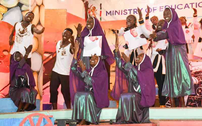 Kenya Institute of Mass Communication students present Kiswahili Choral Verse titled Makutano during the National Drama and Music Festival at Menengai High School in Nakuru, on April 12, 2025. [Kipsang Joseph, Standard]