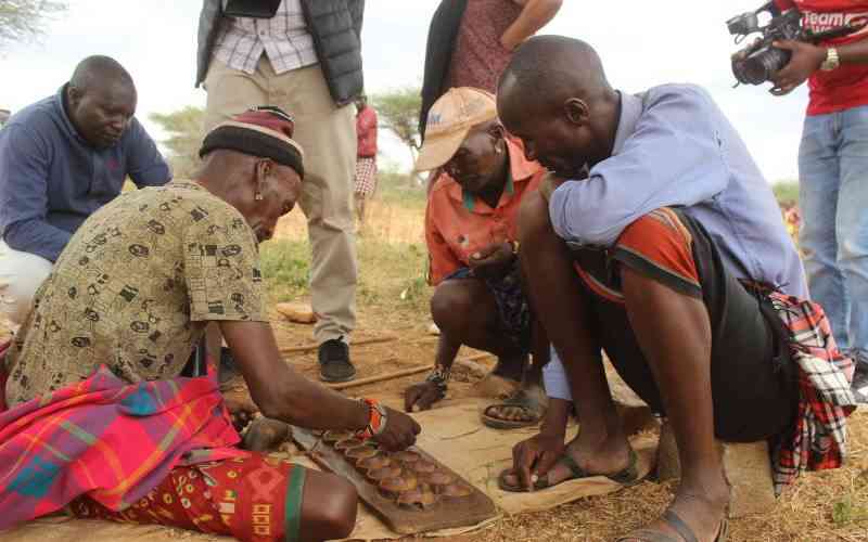 Ngila Village Elders playing Ntotoi game in Samburu County. [File, Standard]
