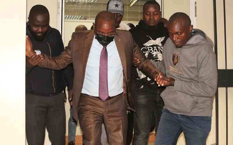 Juja MP George Koimburi (centre) arrives at Milimani Law Courts in Nairobi, on July 23, 2025. [Collins Kweyu, Standard]