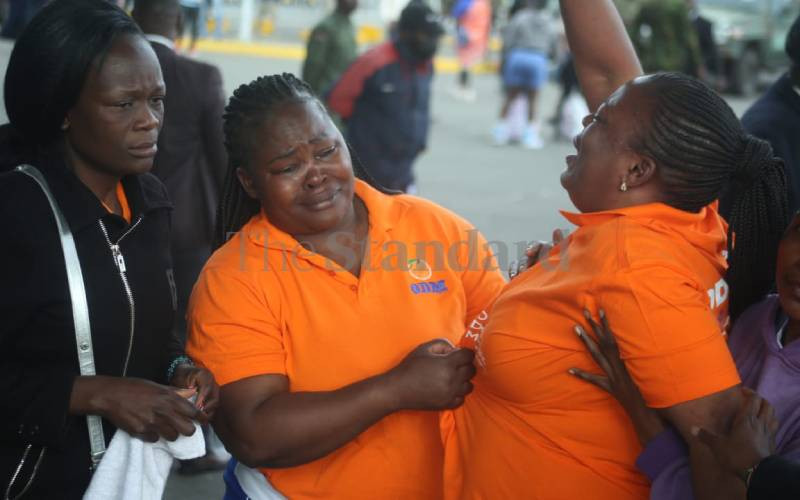 Mourners at JKIA as they wait the arrival of the body of former Prime Minister Raila Odinga. [Collins Oduor, Standard]