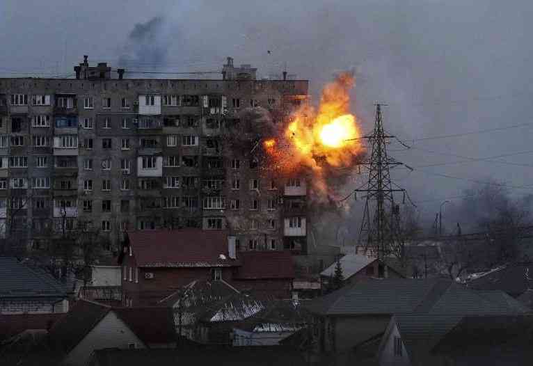 An explosion is seen in an apartment building after Russian's army tank fires in Mariupol, Ukraine, Friday, March 11, 2022. (AP Photo/Evgeniy Maloletka)