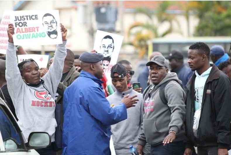 Activists and friends protest outside City Mortuary, Mbagathi way- Ngong road round-about demanding justice following Albert Ojwang's death in police custody. [Jonah Onyango, Standard]