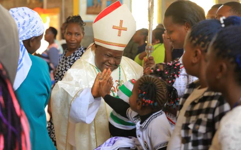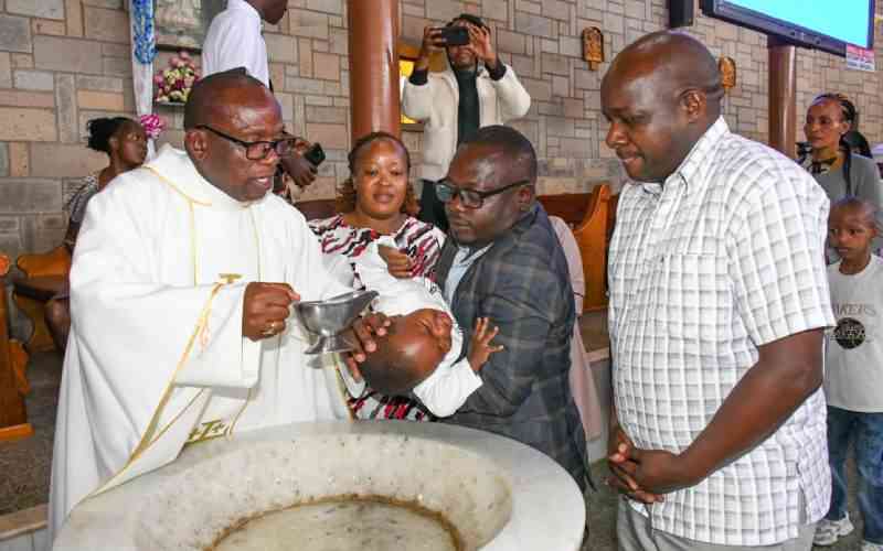 Father John Munyaka baptizes children at Christ the King Cathedral church in Nakuru City during Christmas Day celebrations on December 25, 2025. In his homily to the gathered Catholic faithful, Father Munyaka urged Kenyans to mark Christmas with reverence and reflection, noting that many people today celebrate themselves rather than the body of Jesus Christ. A total of 23 children were baptized during the service. [Kipsang Joseph, Standard]