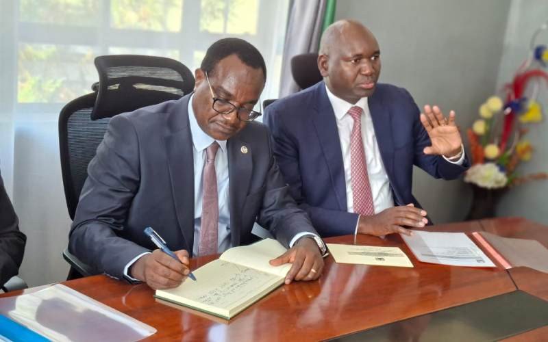 Education CS Dr Julius Ogambo (left) and PS Professor Julius Bitok at AIC Chebisas Boys in Eldoret Uasin Gishu Country during the release of KCSE 2025 results on December 9, 2026. Peter Ochieng, Standards [Peter Ochieng, Standard]