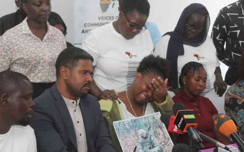 Families of Kenyan Victims of the Russian Army recruitment, addressed the media, urging the Government to repatriate the remains of those who have died in the war and the safe return of those who are alive and wish to come back home. [Benard Orwongo, Standard]