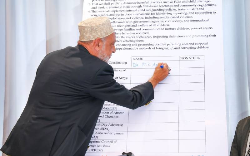 Dr F.S Abdalla of Religious Cordinating Body signs the National Religious Leaders’ Declaration on Child Safeguarding on February 4, 2026. [Jonah Onyango, Standard]