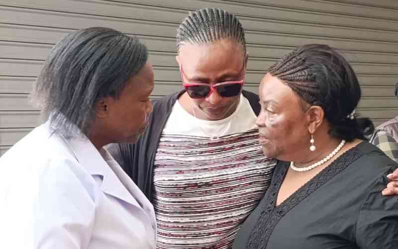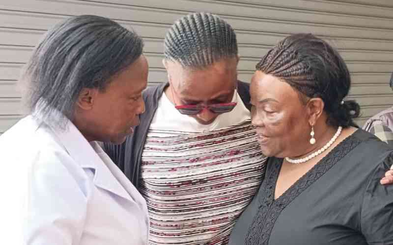 Right -Machakos Senator Agnes Kavindu consult with relatives at Montezuma Funeral Home Machakos after viewing her son's body on February 5, 2026. [Erastus Mulwa, Standard].