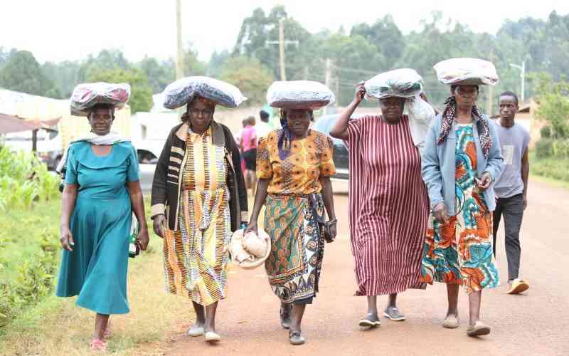 Elderly women carry home blankets after a mentorship program in the campaign against Female Genital Mutilation and Gender-Based Violence in 2024. [Sammy Omingo, Standard]