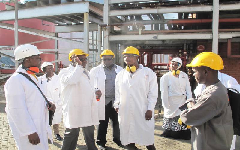 Kenya Electricity Generating Company's Engineer Reuben Wekesa (2nd left) with media crew at their Kipevu One Thermal Power Station at the Port of Mombasa. [File, Standard]